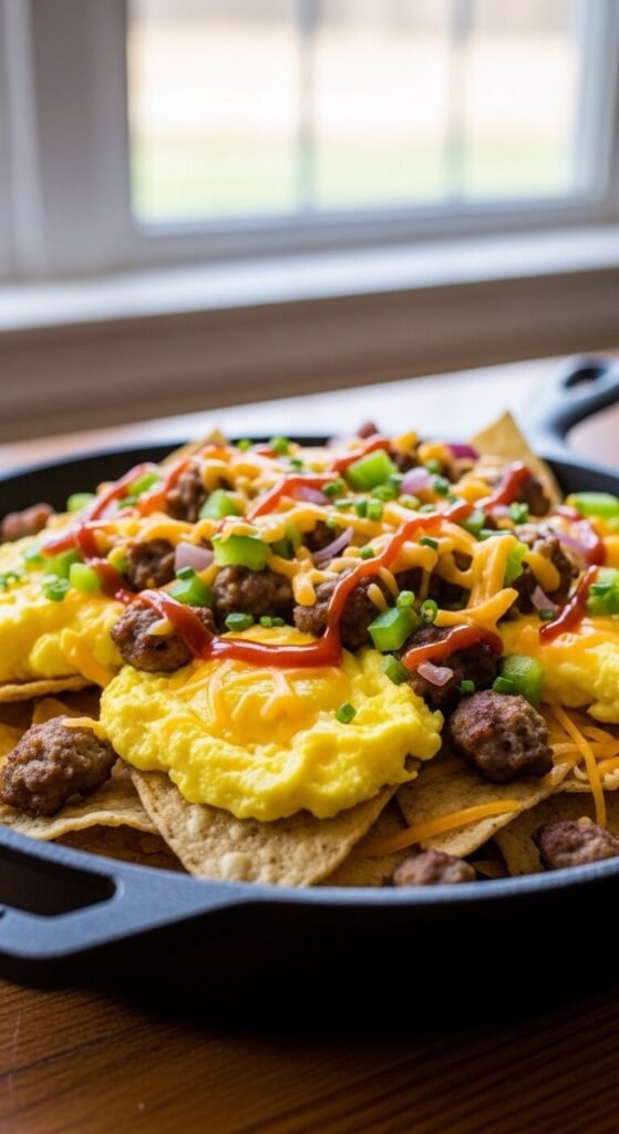 Yes, nachos for breakfast are completely acceptable. Scrambled eggs on chips with melted cheddar and crumbled sausage is a legitimately great morning meal. Cook the eggs soft and slightly underdone — they’ll continue cooking when layered over hot chips. Add diced bell peppers and onion for color and flavor. Drizzle hot sauce on top. Skip the sour cream and use salsa instead for a morning-appropriate topping. This works great for weekend brunch. Use leftover chips from the night before if you have them.