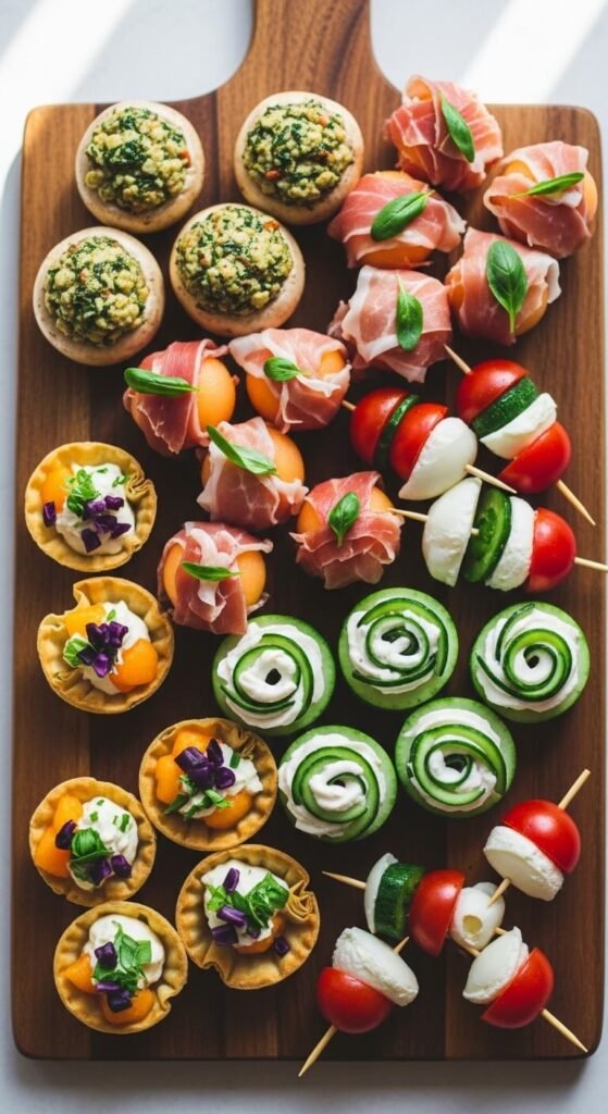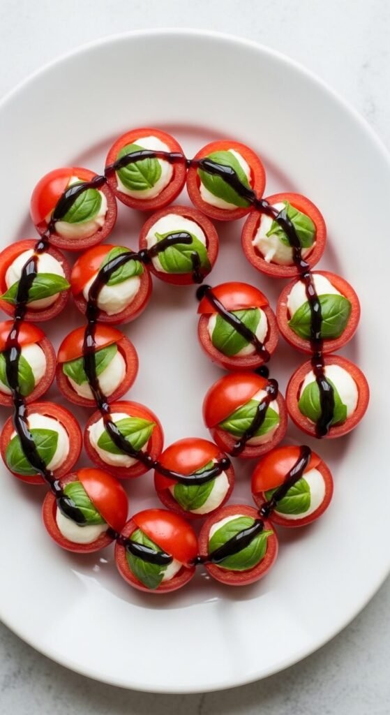 The most delicate bite on this entire list. Cut the tops off large cherry tomatoes and scoop out the insides with a small spoon or melon baller. Fill each with a tiny mozzarella pearl and a small basil leaf. Drizzle with balsamic glaze. Serve chilled. These look stunning and take about 20 minutes to prep for a full platter. Use the scooped tomato insides for a sauce or salad later — no waste. Buy mozzarella pearls in bulk for the best price per piece.