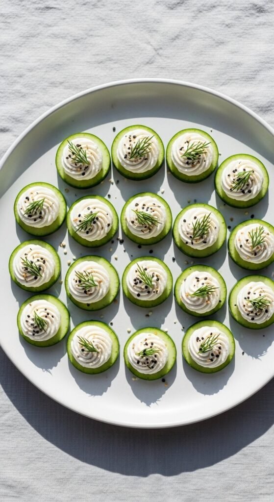 Light, cool, and refreshing — without using that word. Slice English cucumbers thick so they hold toppings well. Pipe or spoon whipped cream cheese on top. Sprinkle with everything bagel seasoning or fresh dill. Done in under 10 minutes. These are great for guests who avoid carbs or heavy foods. Buy store-brand whipped cream cheese to cut costs. Keep the cucumbers cold until plating. They stay crisp for about two hours at room temperature, making them stress-free for the host.