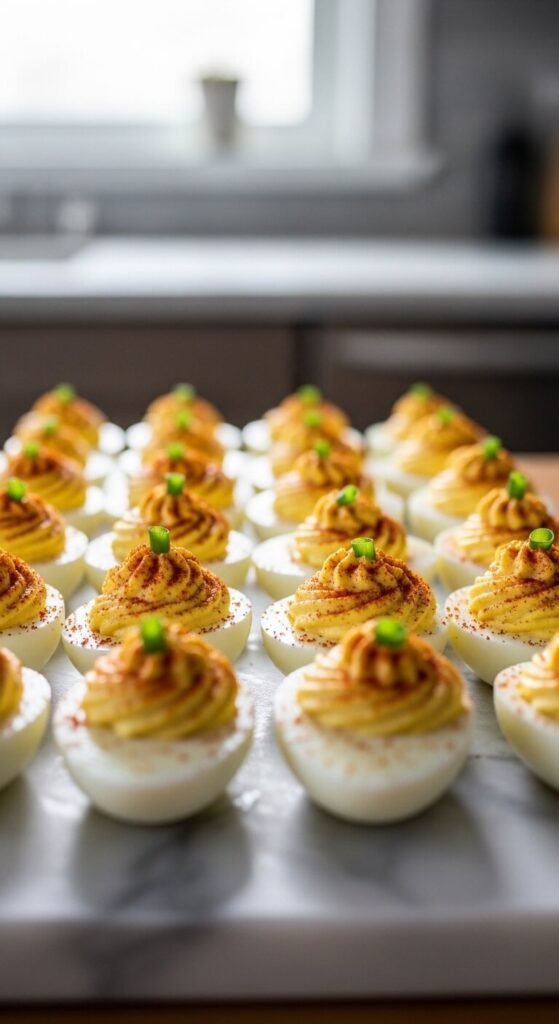 Classic, beloved, and always the first thing gone. Hard-boil eggs, peel, halve, and pop out the yolks. Mix yolks with mayo, mustard, a splash of pickle juice, salt, and pepper. Pipe or spoon back in. Top with smoked paprika. That’s the whole process. Budget tip: buy eggs in bulk — they’re one of the cheapest proteins around. Make the filling a day ahead and refrigerate. Fill just before serving. A deviled egg tray ($10–$15) makes transport and display easy.