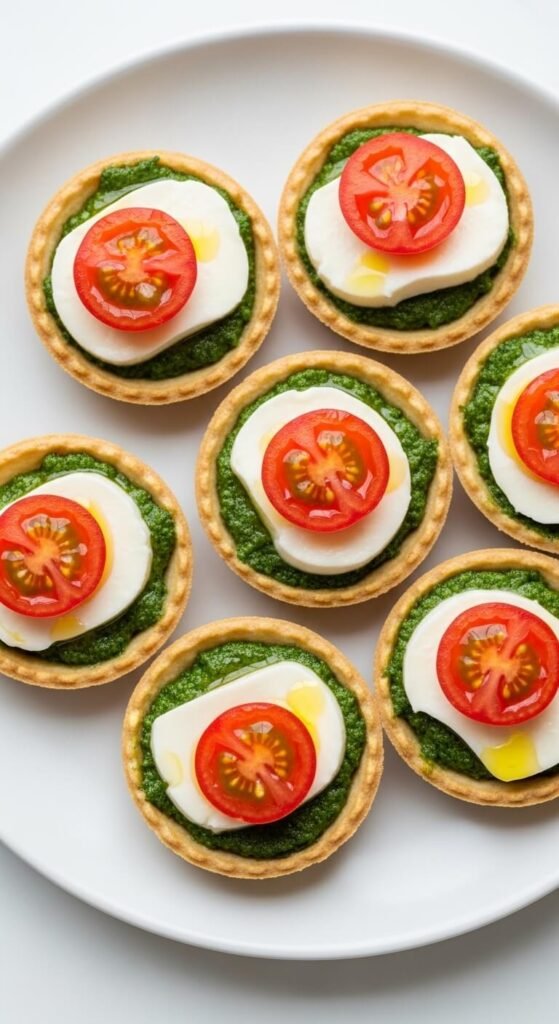 Think of these as upscale bruschetta in a shell. Use store-bought mini tart shells from the baking aisle. Spread a thin layer of store-bought pesto inside each shell. Add a small slice of fresh mozzarella and a halved cherry tomato on top. Bake at 375°F for 8–10 minutes until the cheese melts. Season with salt and pepper. These take under 15 minutes and look stunning on a platter. A jar of pesto and one pack of shells makes about 24 tarts.