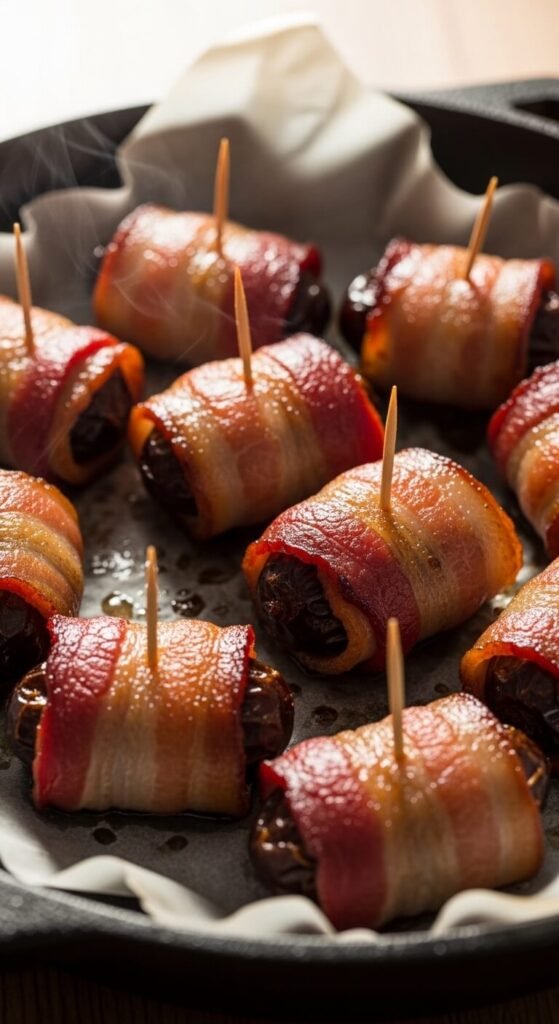 Three ingredients. Zero effort. Maximum payoff. Stuff Medjool dates with a small piece of cream cheese or a whole almond. Wrap with half a strip of bacon and secure with a toothpick. Bake at 400°F for 15–18 minutes until the bacon is crispy. The sweetness of the date with the salty bacon is impossible to stop eating. Medjool dates can be pricey — Deglet Noor dates are a cheaper substitute. Make double the batch because these go faster than almost anything else on the table.