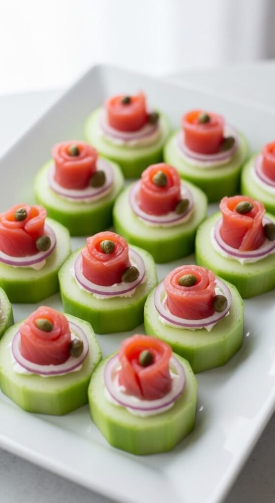 Elegant without being expensive. Slice an English cucumber into thick rounds. Spread a thin layer of cream cheese on each. Top with a small fold of smoked salmon, a caper, and a sliver of red onion. Finish with a tiny squeeze of lemon. Buy smoked salmon in bulk packs or check discount stores for good deals. A 4-oz package goes a long way when used in small portions. These look like they came from a catering company. Prep the components ahead and assemble within an hour of serving.