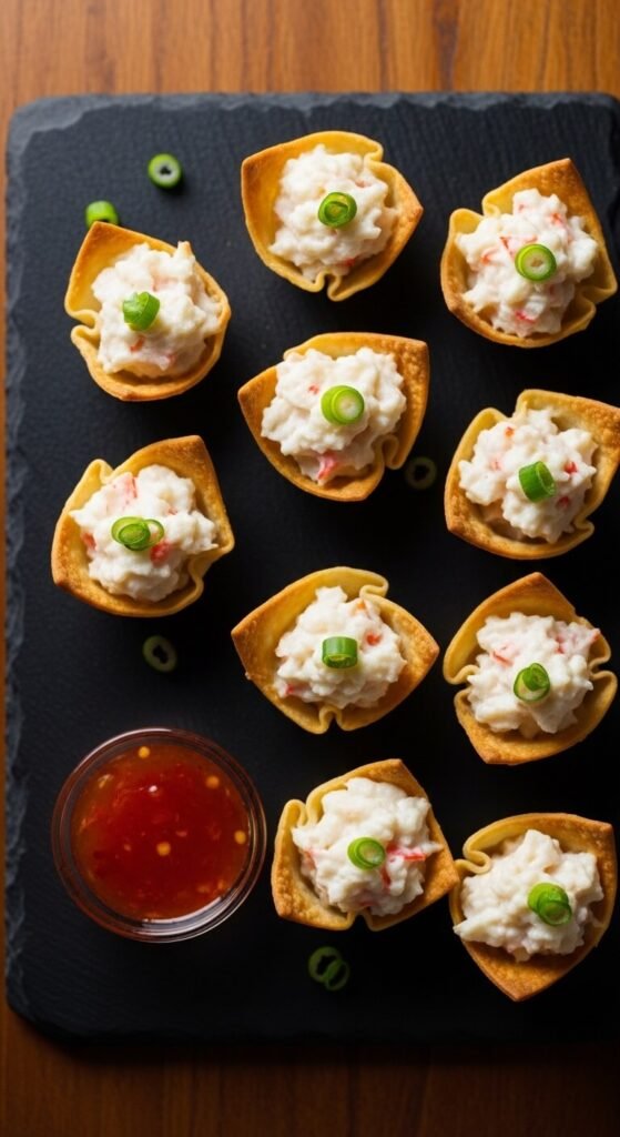 These taste like your favorite takeout order. Mix cream cheese, imitation or real crab meat, green onion, and a splash of Worcestershire until smooth. Press wonton wrappers into a mini muffin tin. Fill with the crab mixture. Bake at 375°F for 12–15 minutes until the edges are golden. Serve with sweet chili sauce on the side. Imitation crab is very affordable and works perfectly in this recipe — no one will know the difference. Make them 30 minutes before guests arrive for the best texture.