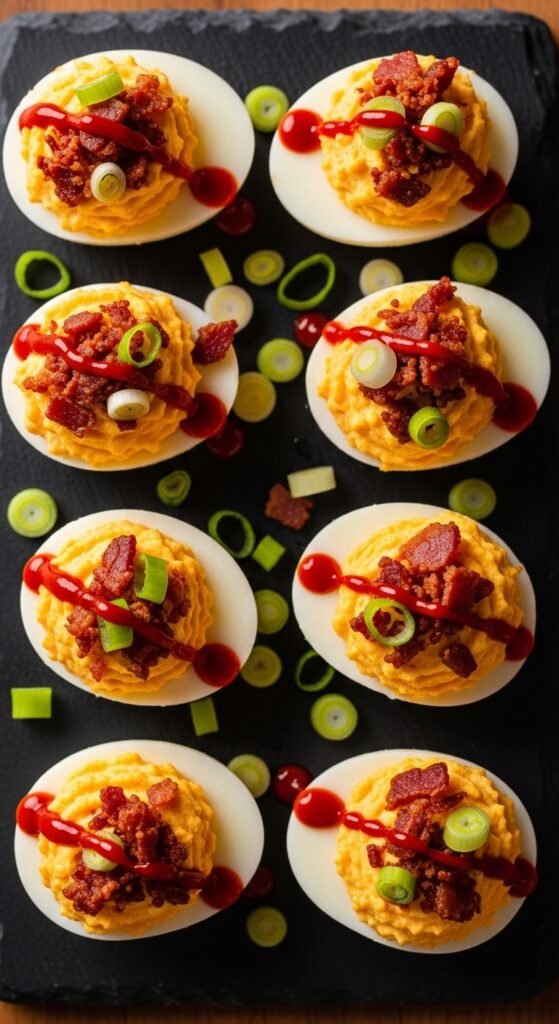 Brush bacon strips with brown sugar and a drizzle of maple syrup, then bake at 375°F until caramelized and crispy. Break into small pieces and lay one on top of each egg. Add a tiny extra drizzle of maple syrup over the filling. The sweet-salty-smoky combination is over-the-top in the best way. This version is perfect for brunch tables where you want something that feels indulgent. Make extra candied bacon — people will eat it straight off the tray before it ever reaches the eggs.