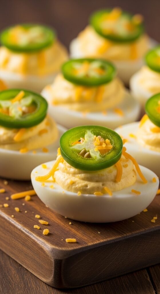 Think jalapeño poppers — but in egg form. Mix cream cheese and shredded cheddar into the yolk base. Add finely diced pickled jalapeños for heat. Top each egg with a fresh jalapeño slice and a pinch of cheddar. Broil them for two minutes if you want the cheese melted and golden. Use pickled jalapeños for tang, fresh ones for pure heat. This version works great as a game-day appetizer. Budget tip: one block of cream cheese makes a big batch.