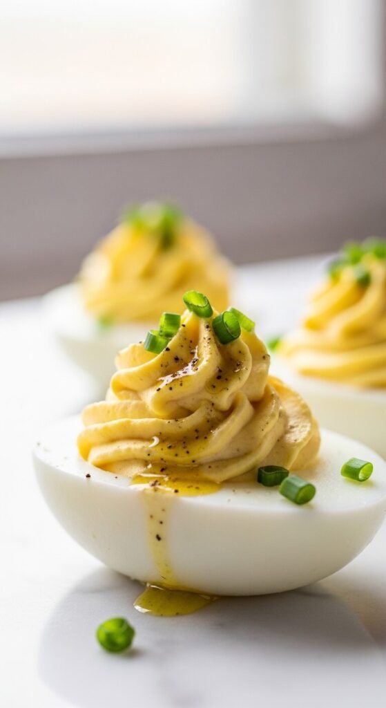 Mix a small amount of mashed potato into the yolk base for extra body. Add sour cream instead of mayo for a tangy, rich flavor. Top each egg with shredded cheddar, bacon crumbles, and sliced chives. It tastes exactly like a fully loaded baked potato. Use leftover mashed potatoes if you have them — this is a great way to use them up. This version is filling and comforting, great for winter gatherings or potlucks where people want something hearty.