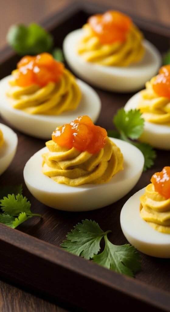 Stir curry powder into the yolk filling — start with half a teaspoon per six eggs. It turns the filling golden and gives it a warm, earthy flavor. Add a small spoonful of mango chutney right on top. The sweet-savory combo is unexpected and totally addictive. Garnish with a single coriander leaf if you have it. Mango chutney is usually under $4 at any grocery store. This version is great for guests who love bold, global flavors. Serve slightly chilled.