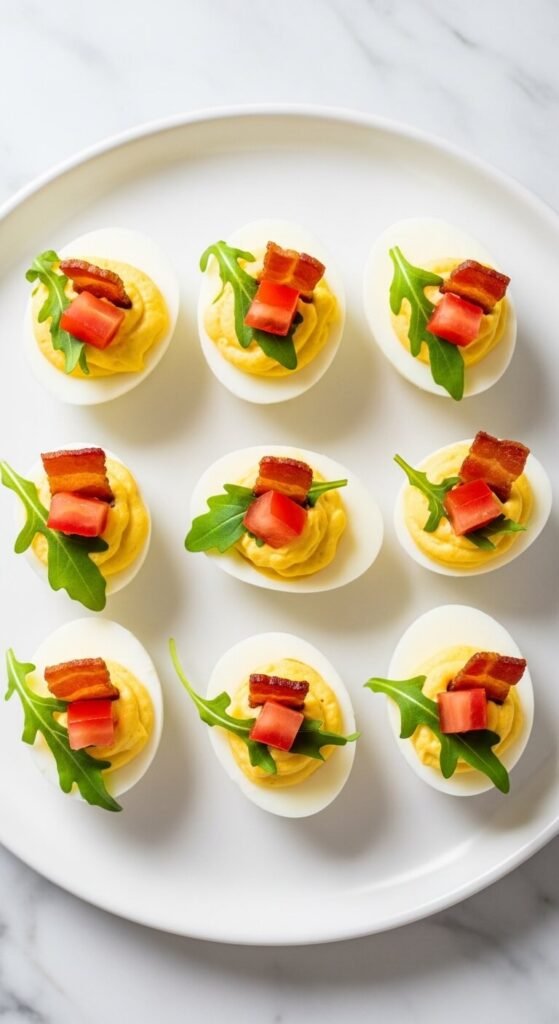 Put your favorite sandwich inside a deviled egg. The filling stays classic — mayo, mustard, salt, pepper. But the toppings make it: crispy bacon pieces, a small cube of ripe tomato, and a tiny leaf of arugula or romaine. Layer them in that order for the best look. Use cherry tomatoes cut into small cubes — they’re less watery. This version is always a crowd-pleaser because everyone already loves a BLT. Make a double batch — they go fast.
