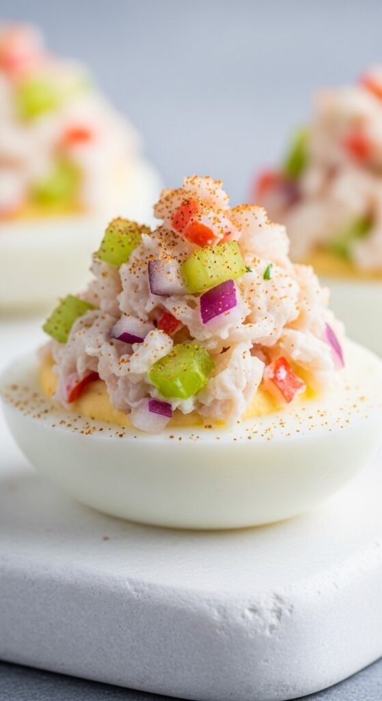 Mix imitation crab (or real crab) with a tiny bit of mayo, diced celery, and a squeeze of lemon. Spoon it right on top of a simply seasoned yolk base. Sprinkle Old Bay seasoning over everything — it’s the perfect finishing touch. Real crab is a treat, but imitation crab works great and costs a fraction of the price. This version feels like a coastal restaurant dish. Serve on a chilled plate to keep everything fresh and firm. Guests always ask for the recipe.