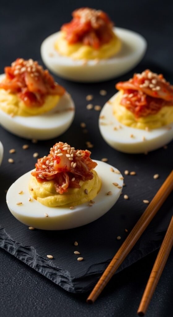 Finely chop kimchi and fold it right into the yolk mixture. It adds tang, heat, and umami all at once. Top each egg with a small piece of kimchi and a sprinkle of sesame seeds. A drizzle of sesame oil over the top pulls the whole thing together. Kimchi is available at most grocery stores now for around $5 a jar. This is an unexpected combination that becomes a fast favorite. Great for guests who enjoy bold, fermented flavors.