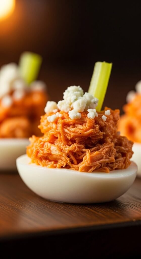 Shred a small amount of rotisserie chicken and toss it in buffalo sauce. Pile it right on top of a creamy yolk base mixed with a little ranch dressing. Crumble blue cheese over everything and add a thin sliver of celery. The whole thing tastes like buffalo wings in one bite. Rotisserie chicken makes this easy and affordable — one chicken gives you enough for a large batch. This version is always the first to go at any game-day spread.