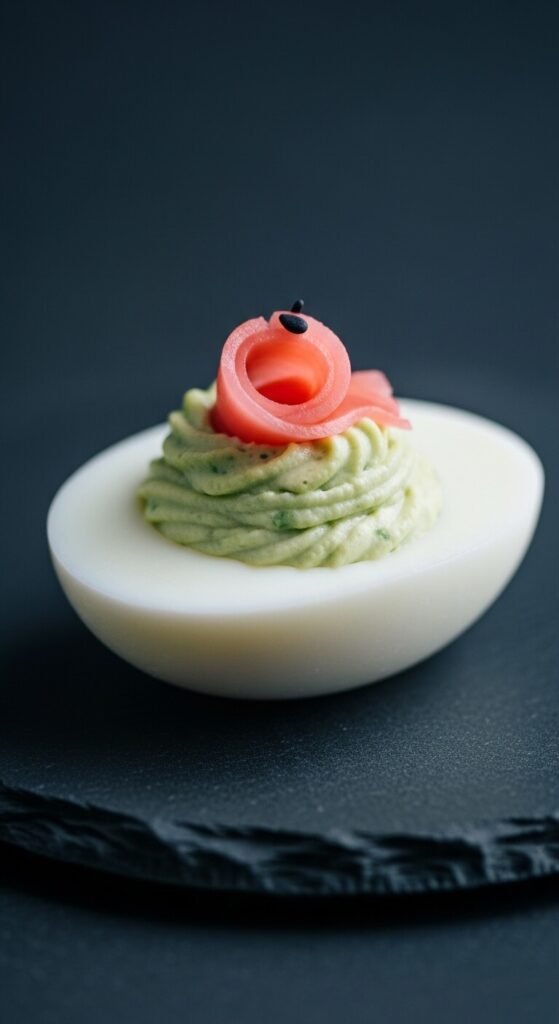 Replace half the mayo with ripe mashed avocado for a creamy, green filling. Add lime juice, garlic powder, and a pinch of salt. It tastes just like guacamole inside an egg. Top with a small cube of tomato and a single cilantro leaf. Use very ripe avocados for the smoothest texture. This version is naturally lower in processed ingredients. Make it the day of serving — avocado can brown quickly. A squeeze of lime in the filling helps slow that down.