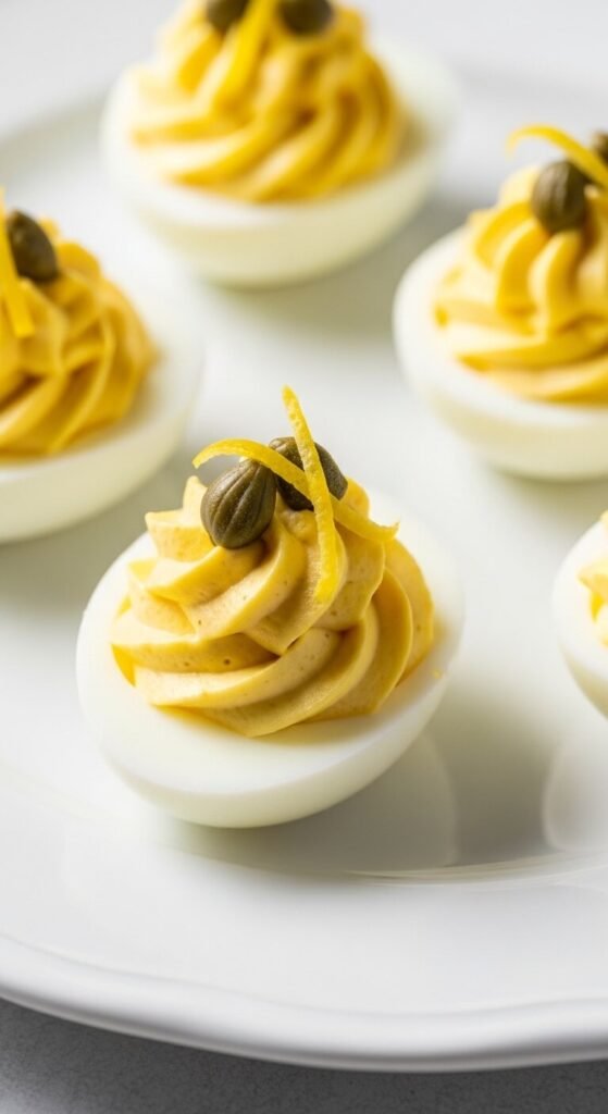 Add fresh lemon zest and a squeeze of lemon juice to the yolk mixture. The citrus brightens the whole flavor. Top each egg with two or three capers and another small strip of lemon zest. Capers are briny and bold — they do a lot of flavor work in a small package. A small jar of capers costs about $3 and lasts months in the fridge. This version tastes clean, bright, and sophisticated. Great for spring gatherings or any event where you want lighter appetizer options.