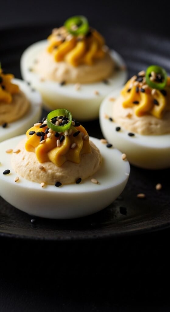 Add a small amount of wasabi paste to the yolk mixture — start with just a quarter teaspoon per egg. It adds a sharp, sinus-clearing heat. Top with a small curl of pickled ginger and a few black sesame seeds. The flavor is clean, bright, and totally unexpected. This version pairs well with soy sauce on the side for dipping. Wasabi paste tubes are inexpensive and last a long time in the fridge. Great for guests who love Japanese-inspired flavors.