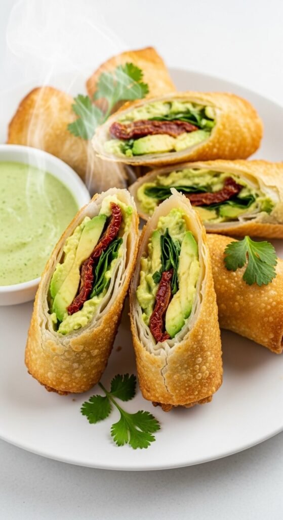 Crispy secret: Brush wrappers with oil before baking for restaurant-quality crunch. Two avocados make 8 egg rolls for around $5. Way cheaper than takeout.