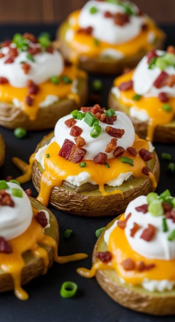 Top with cheese, sour cream, chives, and vegetarian bacon bits. Return to oven until cheese melts.