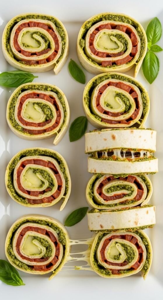 Quick assembly: Use store-bought pesto to save time. One jar makes 3 tortillas worth. These cost pennies per piece and look fancy.