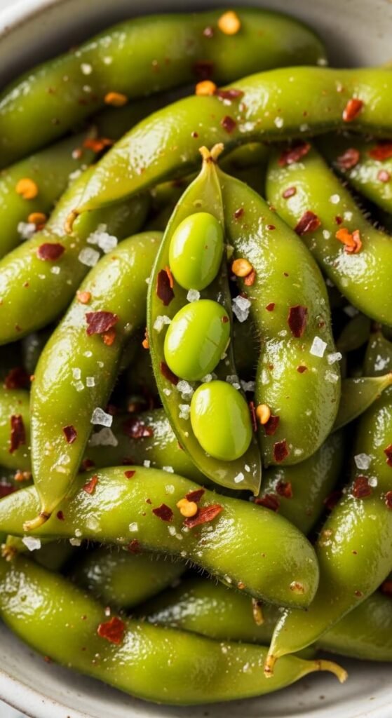 Toss hot pods with soy sauce, honey, garlic, and red pepper flakes. Sprinkle with sesame seeds.