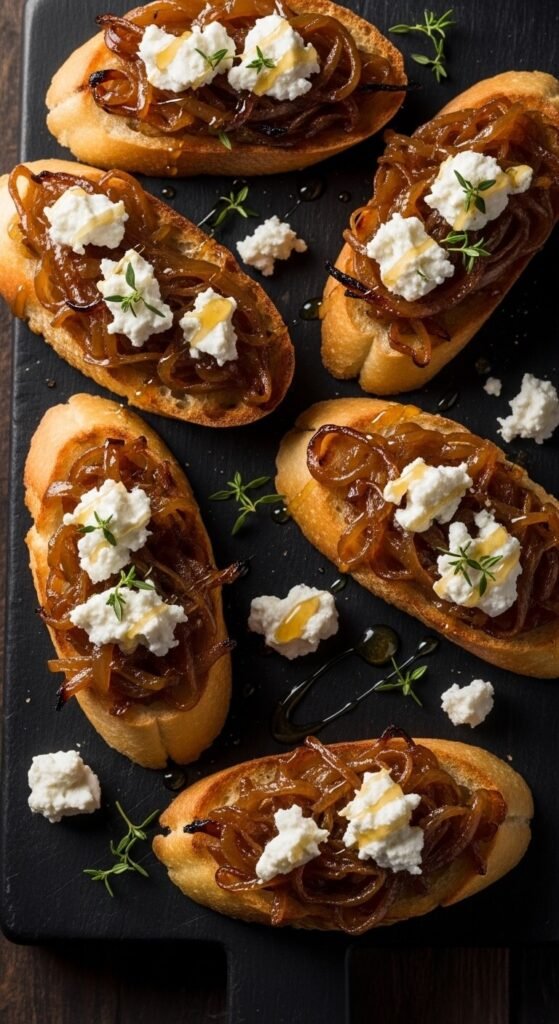 Patience pays: Don’t rush the onions—low heat makes them caramelize perfectly. One onion stretches across 15 crostini. Tastes gourmet but costs under $6.