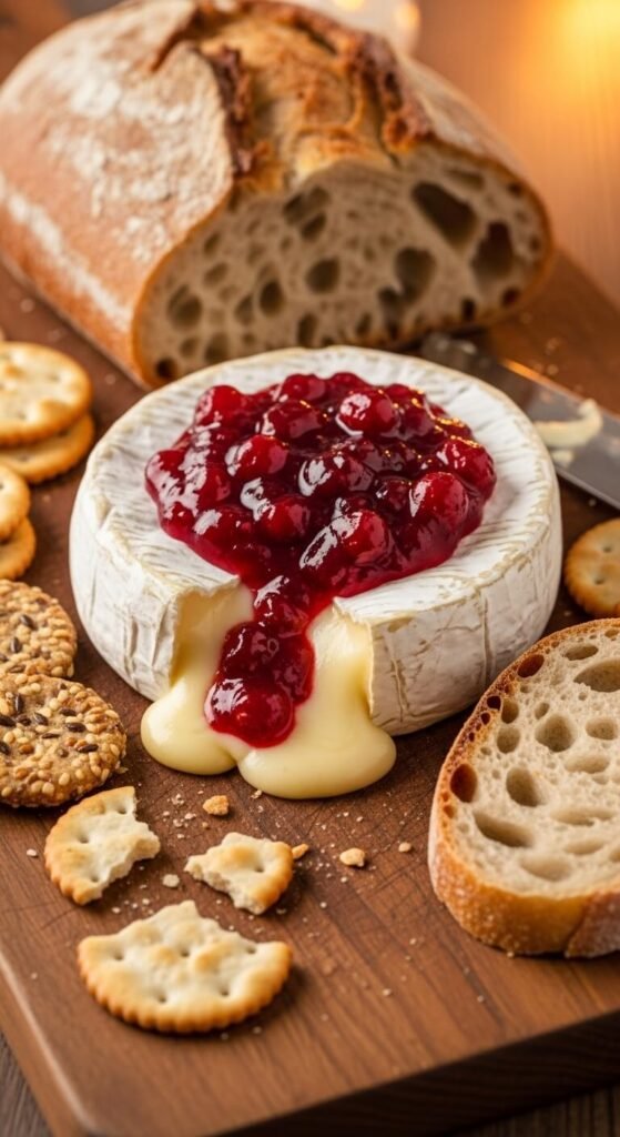Top with cranberry sauce and bake 5 more minutes. Serve with crackers or bread for spreading.