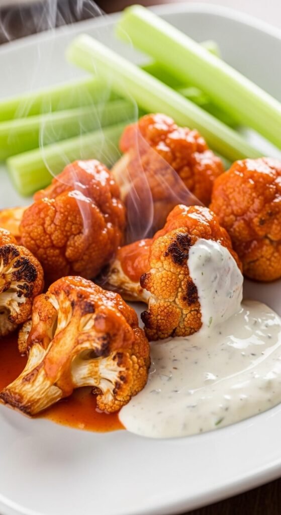 Bake at 425°F for 25 minutes until crispy. Mix melted butter with hot sauce and coat the florets. Serve with ranch or blue cheese dressing.