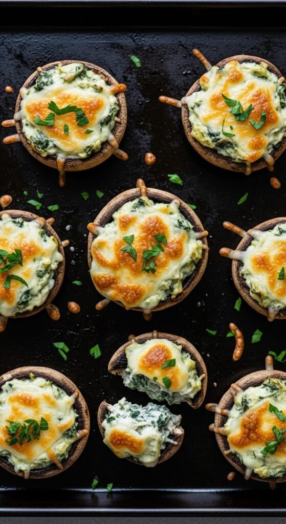 Mix frozen spinach, canned artichokes, cream cheese, and parmesan. Stuff each cap and bake at 375°F for 20 minutes. The filling gets bubbly and golden.