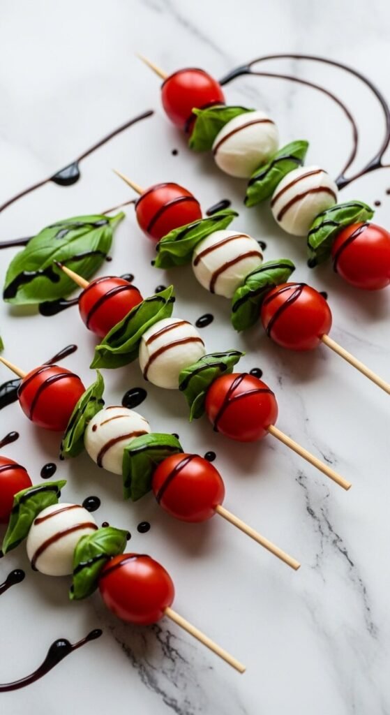 Thread cherry tomatoes, mozzarella balls, and basil leaves onto skewers.