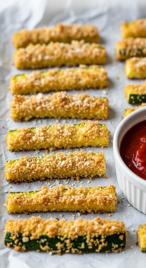 Cut zucchini into fry shapes and coat in breadcrumbs mixed with parmesan.