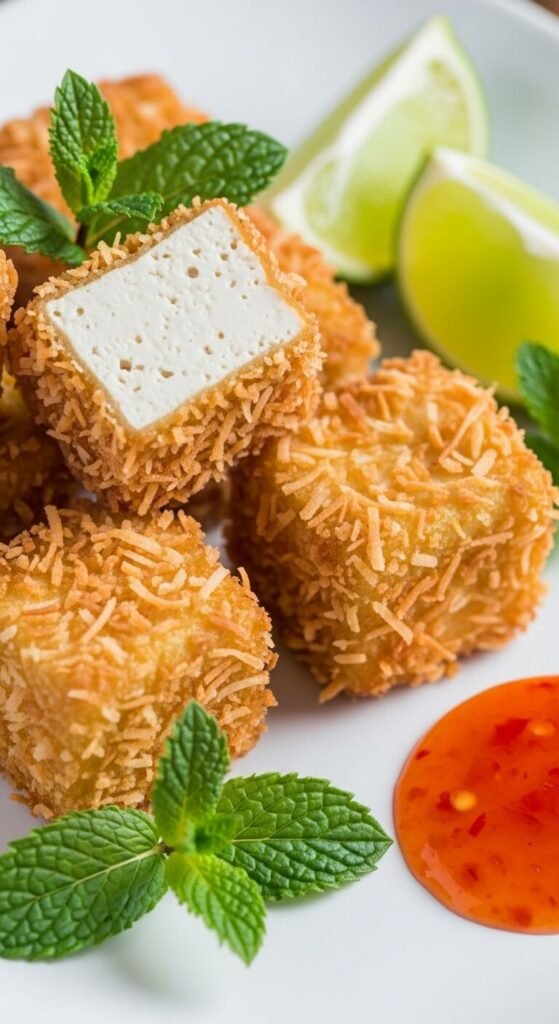 Coat in cornstarch, then coconut flakes. Bake at 400°F for 30 minutes until crispy. Serve with sweet chili sauce for dipping.