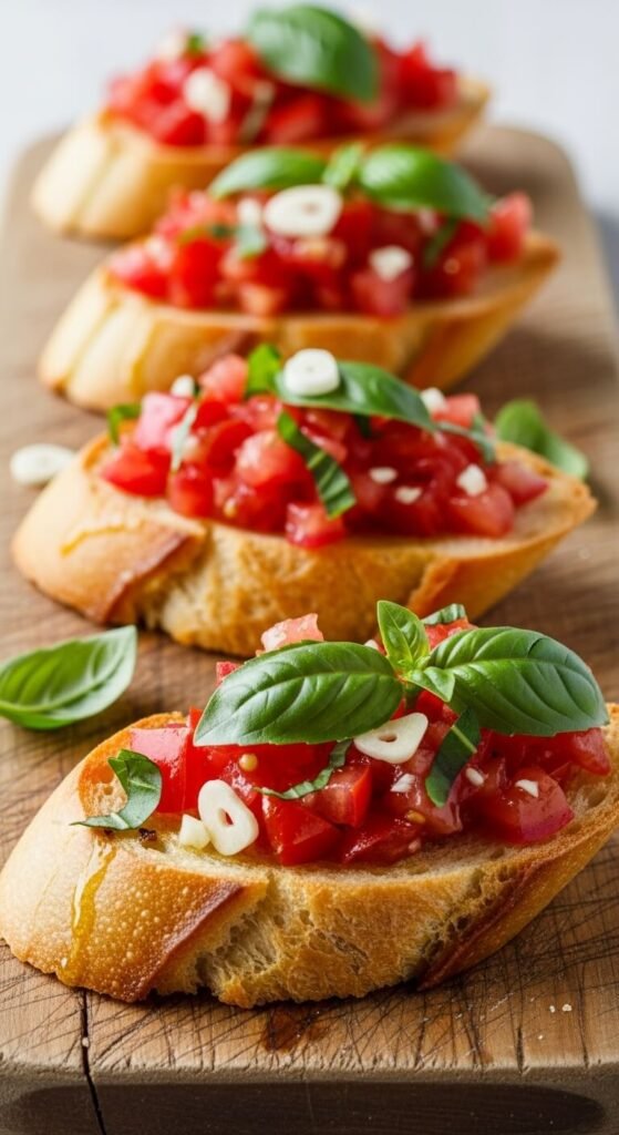 Mix diced tomatoes, garlic, basil, olive oil, and balsamic vinegar. Spoon mixture onto bread just before serving so it stays crunchy.