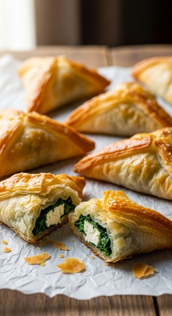Cut into strips, add spinach-feta mixture, and fold into triangles. Bake at 375°F until golden. The phyllo gets flaky and buttery.