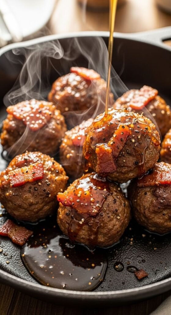Sweet and savory lovers rejoice. Wrap small meatballs in half strips of bacon and secure with toothpicks. Brush with maple syrup and bake until bacon crisps.