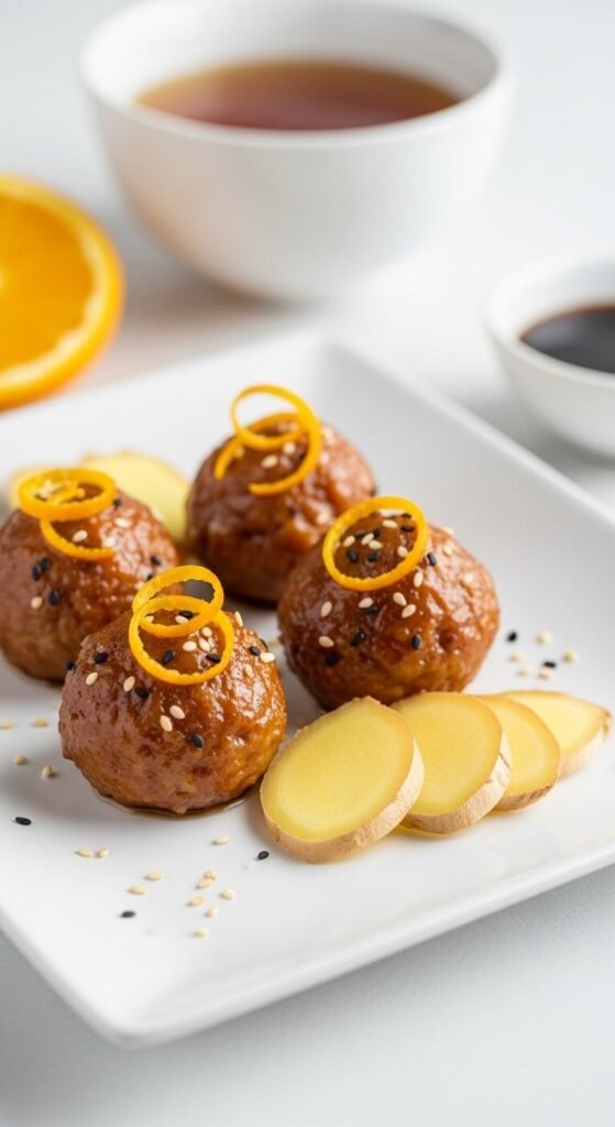 Orange juice and fresh ginger make a bright glaze. Reduce orange juice with soy sauce, ginger, and honey until syrupy. Pour over baked meatballs.
