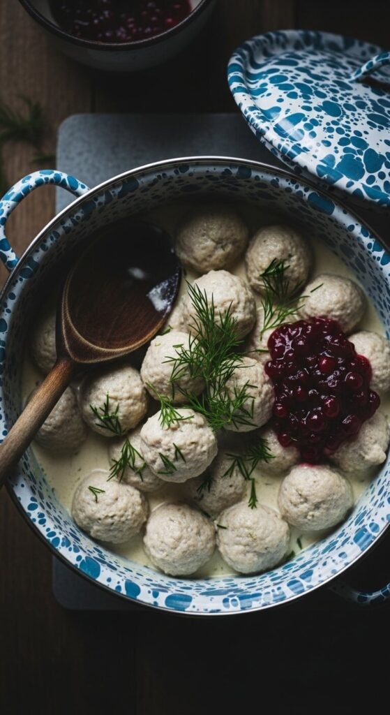 These smaller meatballs pack rich, savory flavor. Combine ground pork and beef with nutmeg and allspice. The creamy gravy uses butter, flour, and beef broth—nothing fancy.