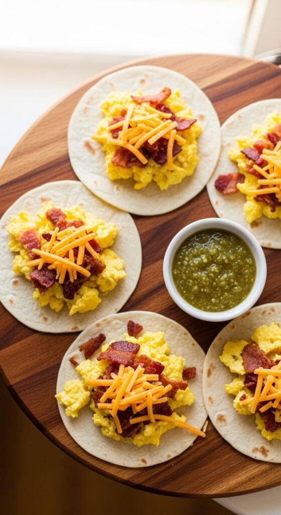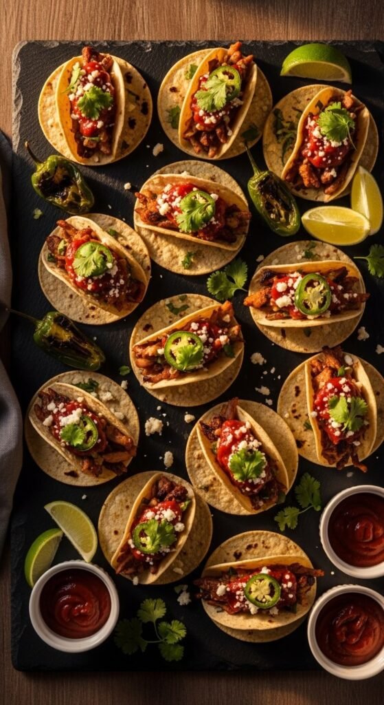 Taco appetizers aren’t just for dinner crowds. Scramble eggs low and slow with butter for the fluffiest texture. Add crispy bacon crumbles and sharp cheddar. Spoon into warmed mini flour tortillas. Top with a small spoonful of salsa verde. These are perfect for brunch parties, baby showers, or morning tailgates. They take under 15 minutes start to finish. Eggs and bacon are pantry staples, so the cost stays low while the flavor stays high.
