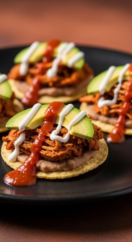 Chicken tinga is smoky, saucy, and deeply satisfying. Shred rotisserie chicken and simmer it in canned chipotle tomato sauce for a shortcut that tastes homemade. Spoon it onto small store-bought tostadas. Add a smear of refried beans underneath to anchor the toppings. Finish with sliced avocado and a drizzle of crema. This is one of the easiest taco appetizer upgrades you can make. Rotisserie chicken keeps the cost low and the flavor high.