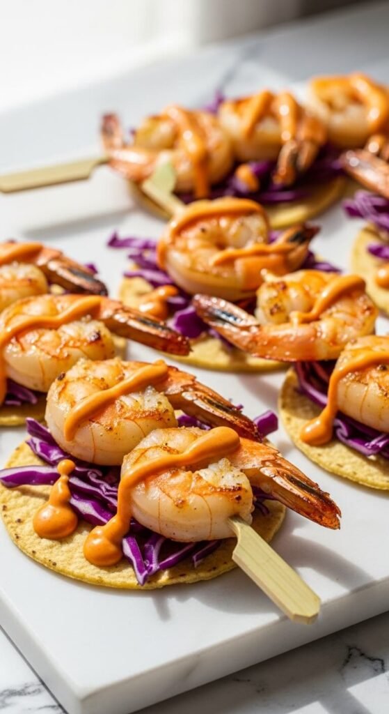 Think tacos — but on a stick. Sear seasoned shrimp in a hot skillet with garlic butter until golden and slightly charred. Thread each shrimp onto a short skewer and rest it over a small corn tortilla round. Top with shredded purple cabbage and a drizzle of chipotle mayo. These are easy to grab at a party without making a mess. Frozen shrimp works perfectly here. Thaw, pat dry, season, and cook in under 5 minutes.