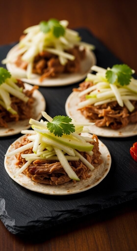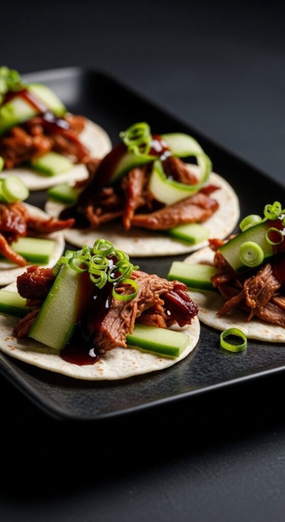 Duck tacos feel fancy without being complicated. Buy pre-cooked duck legs from the meat section (many stores carry them) and shred the meat. Warm it in a skillet with a splash of hoisin sauce and a little five-spice powder. Spoon onto small flour tortillas. Top with cucumber matchsticks and sliced green onion. This flavor profile is rooted in Peking duck traditions — applied to a taco format. Duck legs are more affordable than you’d think, and one leg fills about 10 mini tacos.