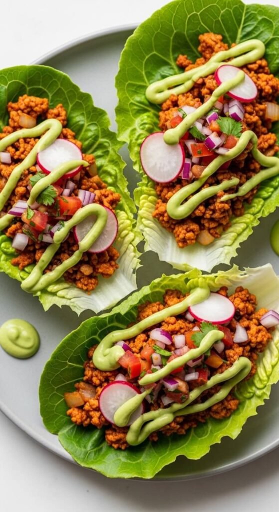 Low-carb doesn’t mean low-flavor. Season ground turkey with taco spices, onion, and garlic. Cook until golden and slightly crispy at the edges. Scoop into large butter lettuce leaves instead of tortillas. Top with pico de gallo, sliced radish, and a drizzle of avocado crema (blend avocado, lime, cilantro, and a splash of water). Ground turkey is lean and inexpensive. These are also great for guests watching their carb intake without wanting to feel left out at the appetizer table.