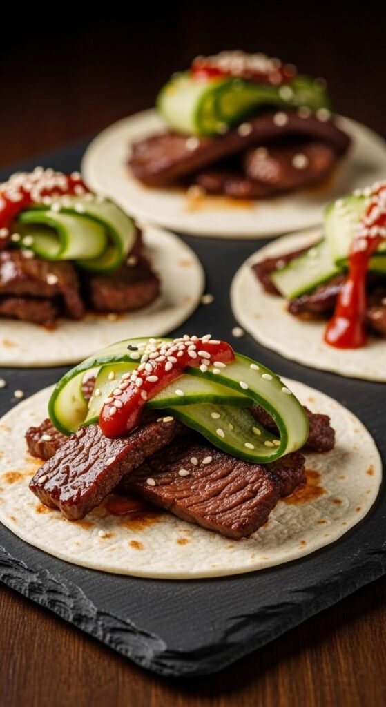 Korean BBQ in taco form is a fusion appetizer that always gets people talking. Thinly slice ribeye or sirloin and marinate in soy sauce, sesame oil, brown sugar, garlic, and ginger for 30 minutes. Sear in a screaming hot pan. Pile onto small flour tortillas and top with quick-pickled cucumber (cucumber slices soaked in rice vinegar, sugar, and salt for 15 minutes). A drizzle of gochujang mayo ties it all together. Budget tip: use thinly sliced beef from the freezer section.