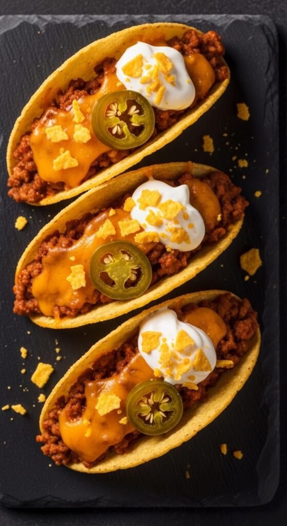 This is nacho flavor — stuffed into a taco. Cook seasoned ground beef and let it simmer with a splash of water for a saucy consistency. Spoon into small crispy taco shells. Layer with shredded cheddar, pickled jalapeños, and sour cream. Finish with a few crushed tortilla chips on top for bonus crunch. These are deeply satisfying and very affordable. One pound of ground beef fills about 20 mini taco shells — plenty for a full party spread without breaking the bank.