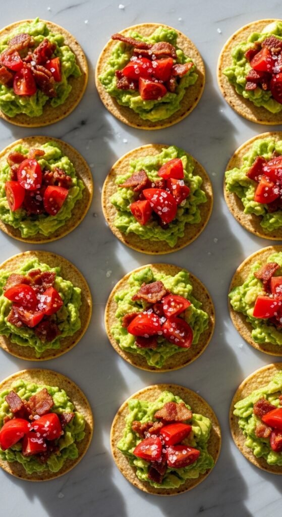 Simple. Fast. Crowd-approved. Smash ripe avocado with lime juice, salt, and a pinch of garlic powder. Spread generously onto small toasted corn tortilla rounds. Top with crispy bacon crumbles and halved cherry tomatoes. Finish with a pinch of flaky sea salt. These come together in under 10 minutes and look put-together with minimal effort. Avocados are most affordable in bulk from warehouse stores — buy extra and store them at room temperature until ripe.