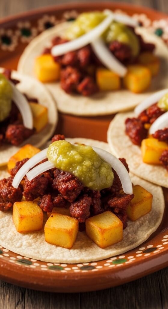 Chorizo and potato is a classic taco filling that punches way above its price point. Dice russet potatoes small and pan-fry until crispy. Cook crumbled Mexican chorizo in the same pan — it releases oil naturally, so no extra fat needed. Combine and spoon into warmed small corn tortillas. Top with tomatillo salsa and raw white onion. This filling is hearty, spicy, and extremely satisfying. One link of chorizo and two potatoes make enough filling for 15 to 20 mini taco bites.