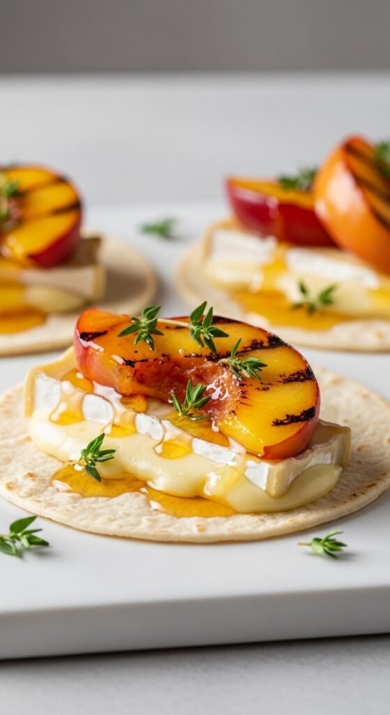 Sweet-savory taco appetizers always spark conversation. Halve small peaches and grill cut-side down for 3 minutes until caramelized. Place a thin slice of brie on a warm small flour tortilla and let it soften from the heat. Add a grilled peach half, a light drizzle of honey, and a few thyme leaves. This sounds fancy, but brie can be found at discount grocery stores for under five dollars. These are best served right off the grill — the brie stays perfectly melted.