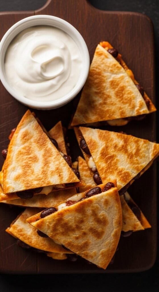 These are mini quesadillas styled like taco bites — and they work brilliantly as appetizers. Mash black beans with chipotle in adobo sauce and spread onto small flour tortillas. Add shredded pepper jack cheese. Fold and toast in a dry skillet until both sides are golden and crispy. Cut into small triangles or wedges. Serve with a smoky sour cream dip (sour cream plus a teaspoon of adobo sauce). These are fully vegetarian, incredibly cheap to make, and ready in under 15 minutes.