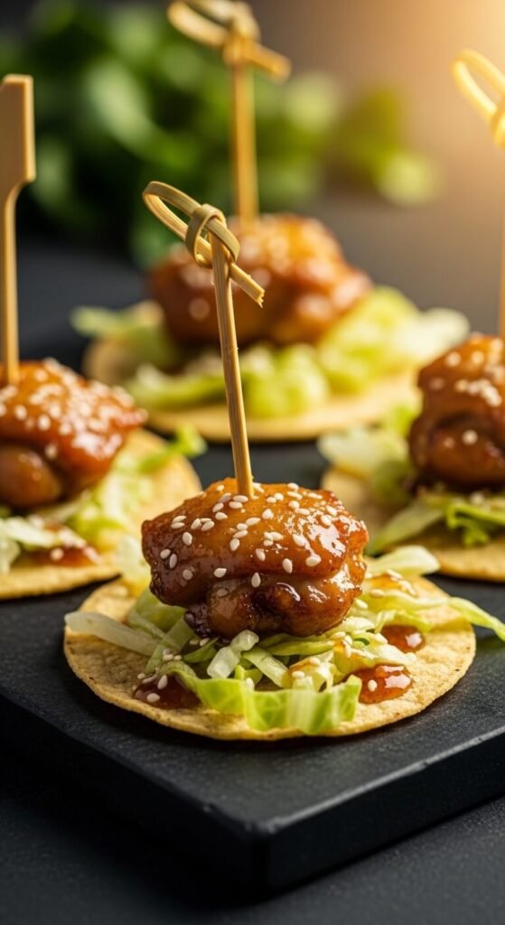 Honey garlic chicken is sweet, sticky, and completely addictive. Marinate chicken thighs in honey, soy sauce, minced garlic, and a little vinegar for 20 minutes. Grill or pan-sear until caramelized and cooked through. Slice into bite-sized pieces and thread onto short skewers. Rest each skewer over a small tortilla round topped with shredded lettuce. Drizzle with sesame sauce. Chicken thighs are cheaper than breasts and stay juicier throughout cooking. This one works great for outdoor summer parties.