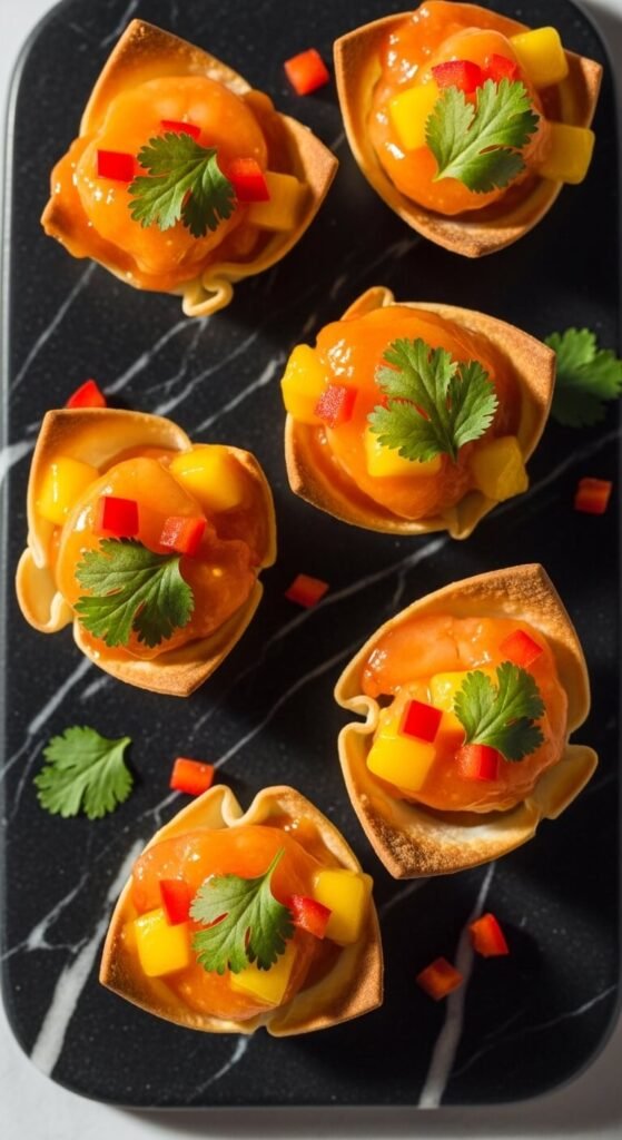 Heat plus sweet is always a winning formula. Sauté shrimp in a pan with butter, garlic, and a store-bought mango habanero sauce (widely available and inexpensive). Cook until the glaze thickens and coats each shrimp. Spoon into small baked wonton cups. Top with diced red bell pepper and fresh cilantro. Adjust the sauce amount to control heat level. These look stunning on a serving board and taste like something from a specialty restaurant — at a fraction of the cost.