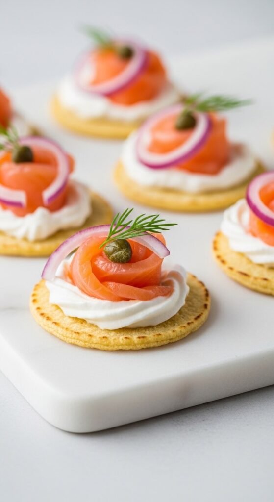 These bring a brunch-party energy that guests love. Spread whipped cream cheese onto small warmed corn tortilla rounds. Lay a thin fold of smoked salmon on top. Add a few capers, thin red onion rings, and a tiny sprig of dill. That’s it. No cooking required beyond warming the tortillas. Smoked salmon can be found in small, affordable packages at most grocery stores. These take about 5 minutes to assemble and look absolutely polished on a serving board.