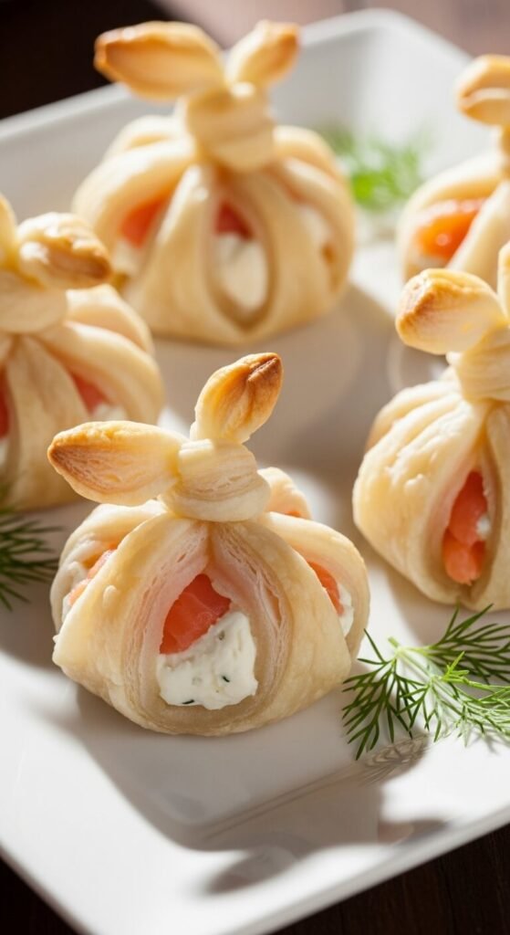 Spread cream cheese on pastry squares. Add smoked salmon piece and fresh dill. Gather corners to center and twist closed.